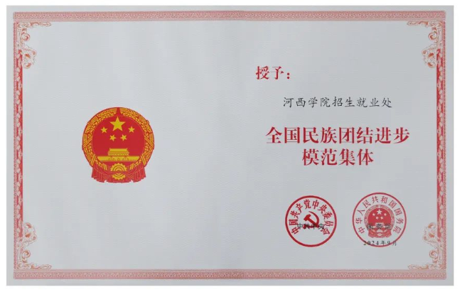 9月27日上午,全国民族团结进步表彰大会在北京举行。会议表彰了352个全国民族团结进步模范集体和368名全国民族团结进步模范个人。其中,河西学院招生就业处荣获“全国民族团结进步模范集体”称号。