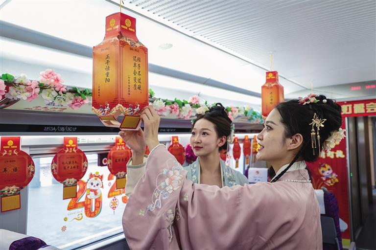 为了让旅客欢乐过节,国铁兰州局在各大车站、部分列车上开展了非遗进站车、猜灯谜等丰富多彩的主题文化活动。兰州车站候车大厅内,工作人员将一碗碗现煮的元宵分发给旅客,还为旅客准备了桂圆红枣茶和红糖生姜水等养生茶;银川车站在候车室组织了猜灯谜、投壶等传统活动,精心策划了现场DIY灯笼环节,邀请候车的小朋友和爸爸妈妈一起动手制作灯笼;天水车站组织开展了“文化盛宴闹元宵,非遗传承绽新光”主题活动,通过猜灯谜与关峡竹编非遗展示,为往来旅客带来了一场别开生面的视觉文化盛宴。兰州客运段在D8912次列车上组织开展了“列车灯谜会 元宵喜乐行”活动,乘务员身穿魏晋、唐、宋、明各个朝代的服饰,为旅客带来汉服国风秀。