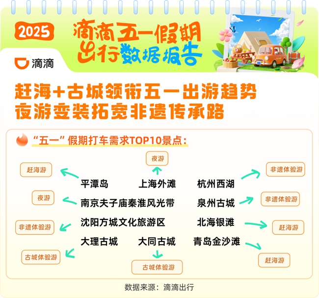 这个假期,非遗深度体验出圈。滴滴出行数据显示,前往古城古镇古街的打车需求同比上涨46%,其中泉州古城、大理古城、大同古城进入五一全国打车需求前十景点。不少景区推出夜间深度游活动,具有灯光造景、非遗集市、沉浸式演绎等夜游核心吸引物的文旅街区打车需求火爆。长沙太平老街历史文化街区、唐山河头老街、无锡清名桥历史文化街区、南京夫子庙秦淮风光带、西安大唐不夜城等夜间打车需求占比过半。