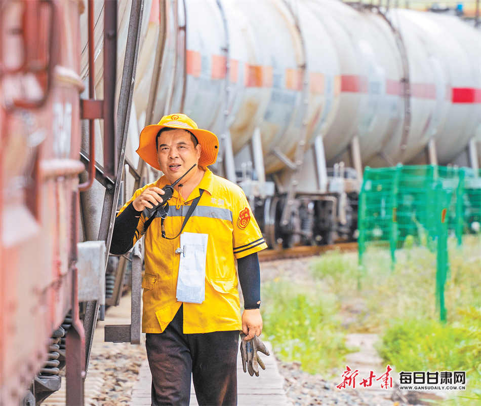 兰州西车辆段检修车间调车长用对讲机联系司机。