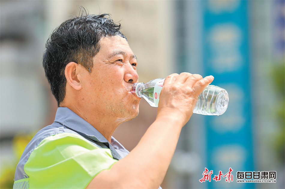 环卫工人喝水降温。