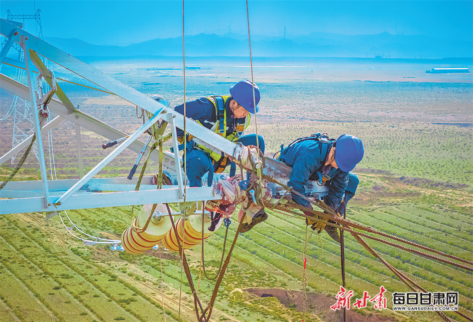 在甘肃陇东直流配套新能源330千伏送出工程(白银)景泰北升压站,国网白银供电公司工作人员在高空作业。