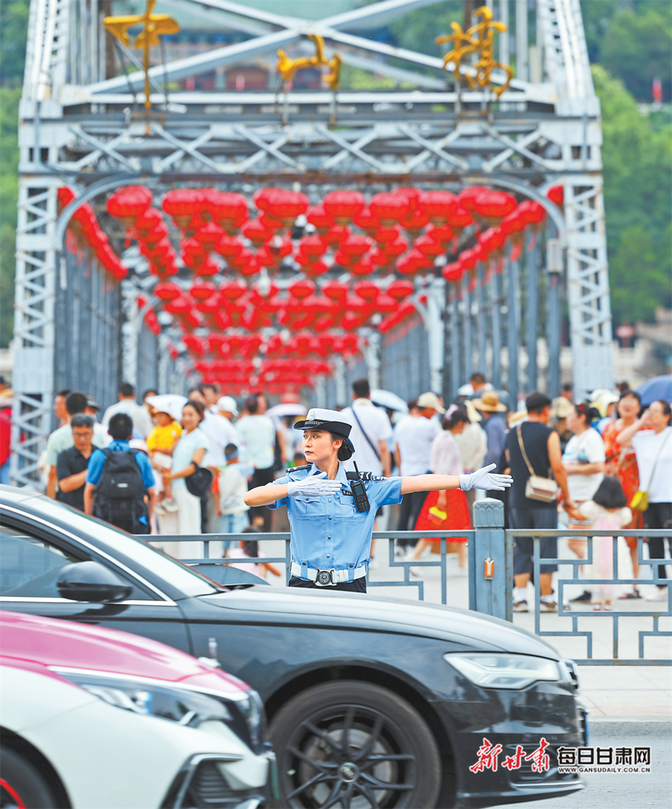 交警在兰州中山桥执勤。