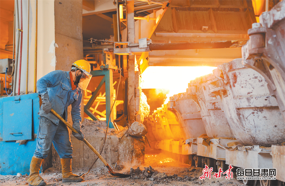 甘肃金达化工有限责任公司工人清理炉前渣体。