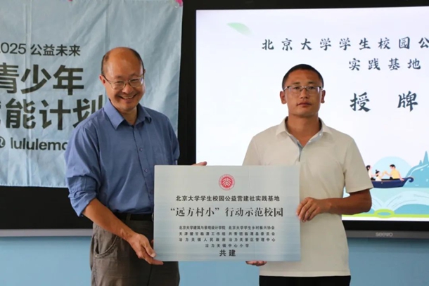 结营仪式上,作为活动指导单位之一的北京大学建筑与景观设计学院牵头为冶力关中心小学授予了“北京大学学生校园公益营建社实践基地——远方村小行动示范校园”的称号牌匾。该基地由天津援甘工作组、共青团临潭县委等部门协作共建,这预示着北京大学相关院系及学生团体将以冶力关中心小学为基地和临潭县开展更多交流和合作。(北京大学学生乡村振兴协会)