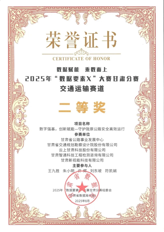 近日,2025年“数据要素×”大赛甘肃分赛落下帷幕,交设股份参与申报的项目《数字强基,创新赋能——守护陇原公路安全高效运行》凭借其创新实践与显著成效,荣获交通运输赛道二等奖。
