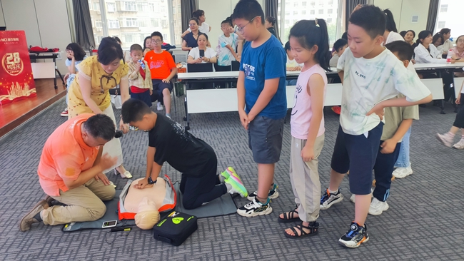 课堂上,第一反应志愿服务中心的老师通过演示、互动的方式进行心肺复苏、海姆立克、AED设备的使用教学。小朋友积极听讲,并参与到互动中,现场氛围火热。
