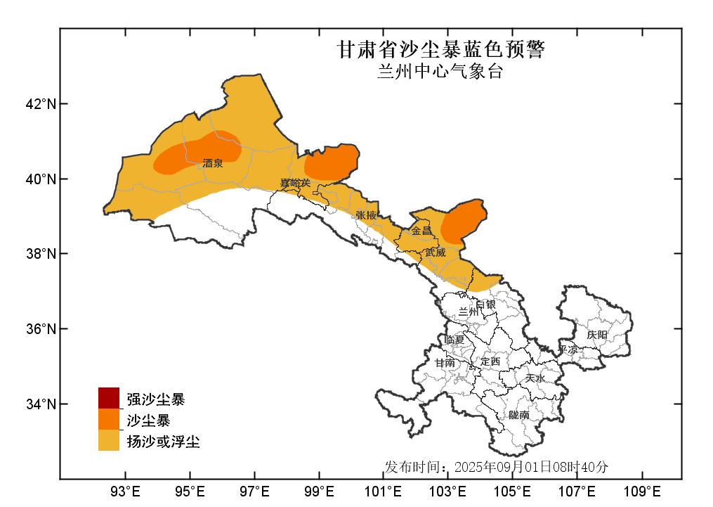 兰州中心气象台2025年9月1日8时40分发布沙尘暴蓝色预警:预计未来24小时内,河西五市部分地方将出现扬沙或浮尘,其中,酒泉市西北部及东部、武威市北部将出现沙尘暴。请注意防范!(来源:甘肃预警发布)