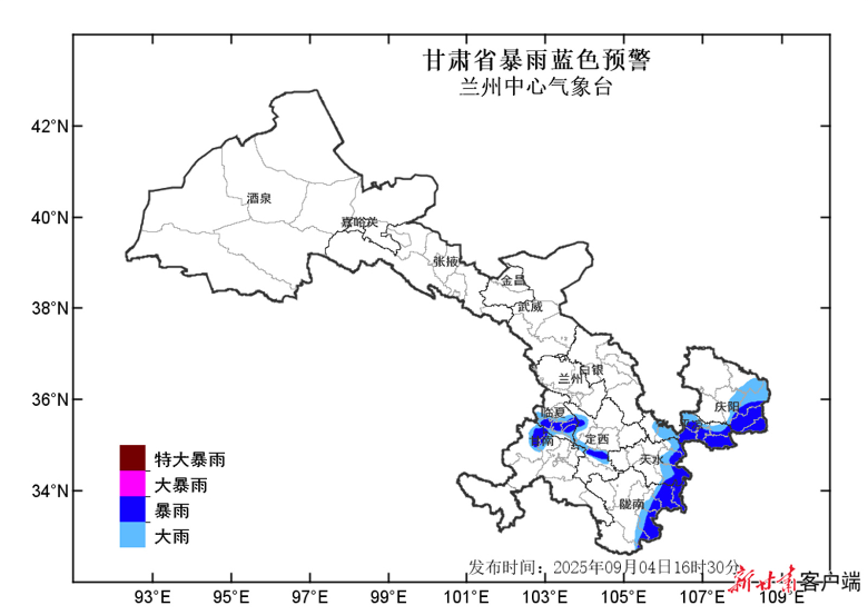 新甘肃客户端兰州9月4日讯(新甘肃·甘肃日报记者 王思璇)记者从甘肃省气象局获悉,兰州中心气象台于今天下午发布暴雨蓝色预警。