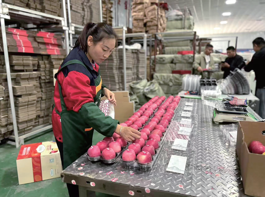 农户马娟就是其中之一。她在包装线上熟练地给苹果贴标签:“家里有一点果园,活不多的时候就来这里打工,一天能挣100元,我挺知足。”