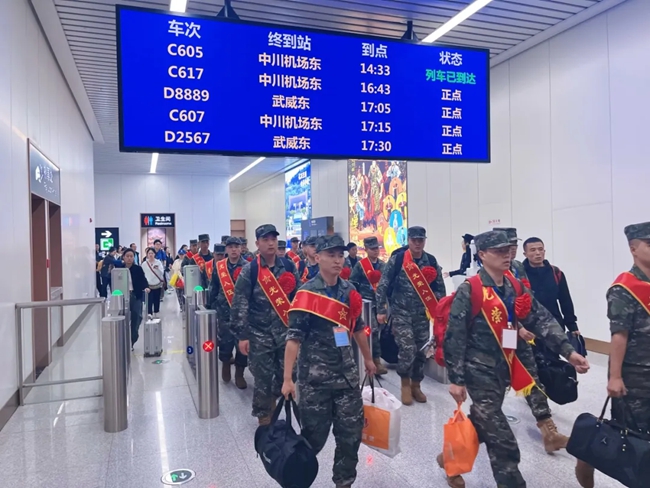 在持续做好高位运行客流服务的同时,中川机场东站顺利完成新兵运输任务,从到达至出站环节专设“新兵运输绿色通道”,实现全程引导、路线清晰、动线顺畅,在车站候车区专设服务点供应热水,用贴心服务传递对入伍新兵的重视与敬意,确保运输工作的有序进行。