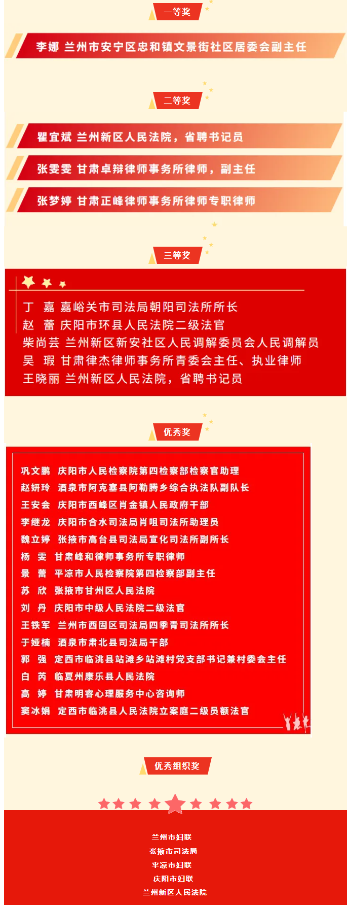 2025年甘肃省婚姻家庭纠纷人民调解工作“大比武”活动于9月22日至25日在甘肃省高级人民法院成功举办。此次活动中,来自全省14个市州及兰州新区的73名婚调骨干齐聚一堂,展开激烈角逐,通过笔试、知识竞赛、现场模拟调解、文书制作等多个环节,全面考察了参赛选手的专业素养和调解能力。最终评选出一等奖1名,二等奖3名,三等奖5名,优秀奖15名,优秀组织奖5组。