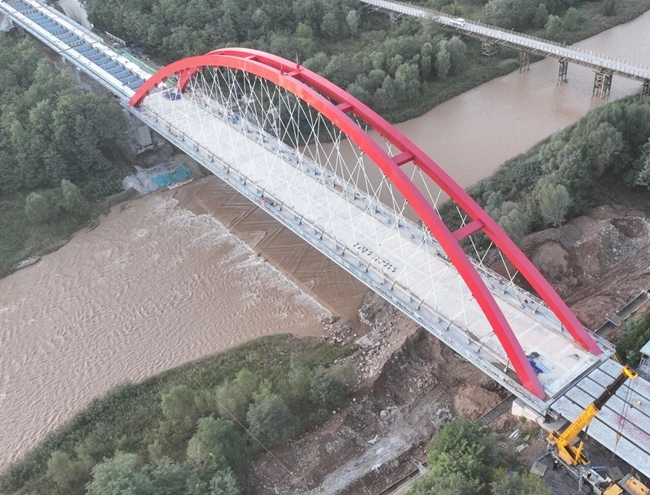 长庆桥是我省首座提篮式钢箱网状吊杆下承式系杆拱桥,也是长罗项目关键控制性工程。桥梁全长310.6米,主跨径148米,是同类型桥梁中跨径最大的一座。整桥结构轻盈、造型现代,既凭借轻盈的结构与现代的造型彰显设计美感,更以主跨一跨过河的突破,有效解决了泾河行洪难题,未来还将成为泾河标志性景观。