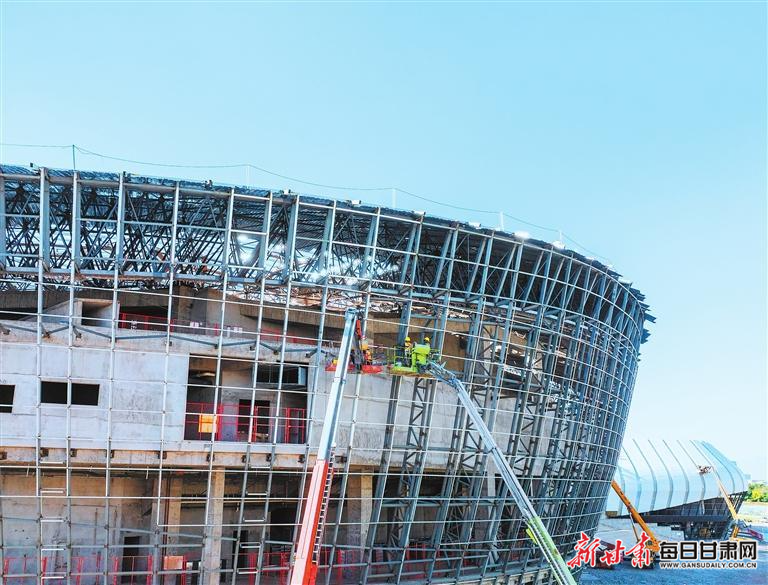 国庆中秋假期,工人在张掖奥体中心工程项目现场加紧施工。新甘肃·甘肃日报通讯员 杨潇