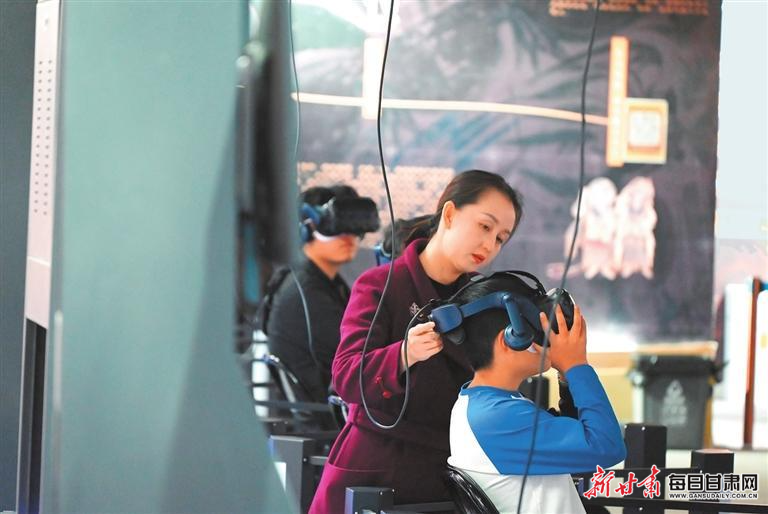在敦煌市莫高窟“寻境敦煌——数字敦煌沉浸展馆”,工作人员为游客提供服务。新甘肃·甘肃日报通讯员 张晓亮