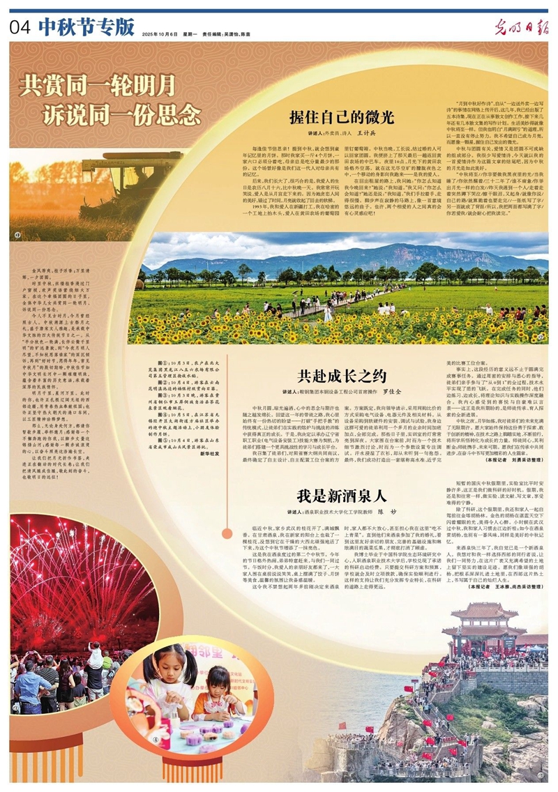“月到中秋好作诗”,自从“一边送外卖一边写诗”的事情在网络上传开后,这几年,我已经出版了五本诗集,现在正在从事散文创作工作,接下来几年还有几本散文集的写作计划。生活美妙得就像中秋将至一样。但我也明白“月满则亏”的道理,所以一直没有停止努力。我不希望自己成为月亮,而愿像一颗星,握住自己发出的微光。