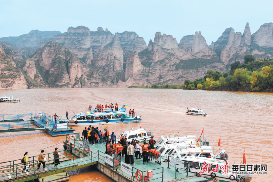 游客乘船在永靖县炳灵寺5A级景区游览。新甘肃·甘肃日报通讯员 史有东