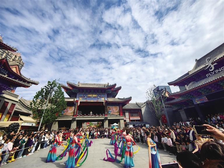 在飞天广场“交融·画壁奇缘”,借助先进的动态投影技术,敦煌壁画上的飞天仙子“破壁”而出,衣袂飘飘,翩然起舞,令游客倍感惊喜;行至华夏广场“万象·乐舞市集”,游客们可以参与互动盖印,体验古商埠的喧嚣与活力;而当队伍抵达天街西广场,“震岳·千壁金刚”以雄浑刚健的舞姿,撼动着每一位观者的心魄,来自广东的摄影爱好者王女士连连按下快门,记录下这震撼的瞬间。
