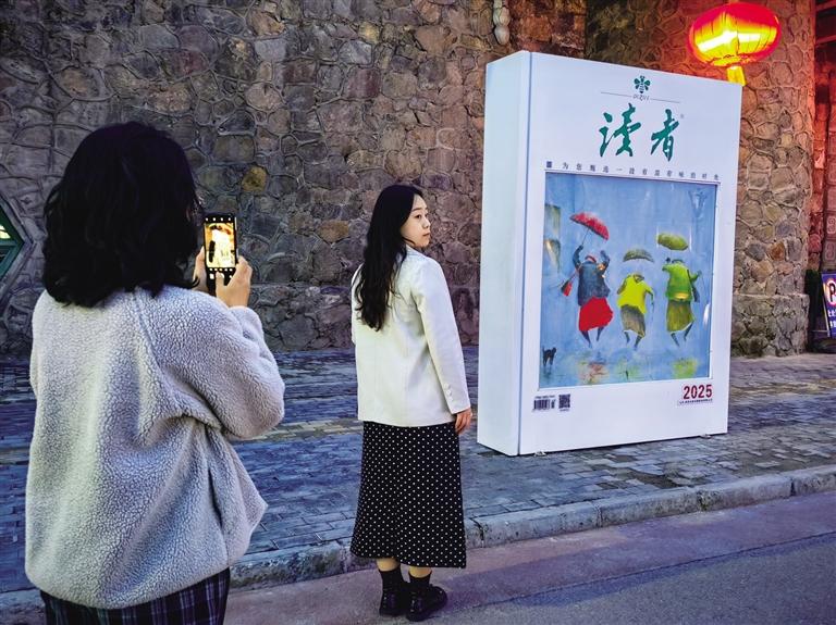 在《读者》杂志牌前打个卡 记者 高宏梅 摄