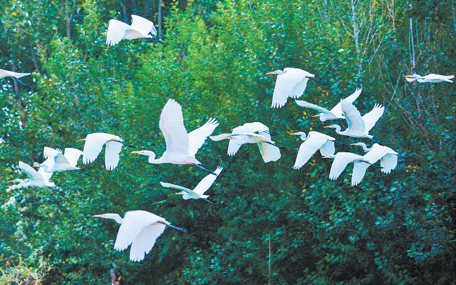 近日,大批白鹭在敦煌党河湿地飞舞、觅食。新甘肃·甘肃日报通讯员 王斌银