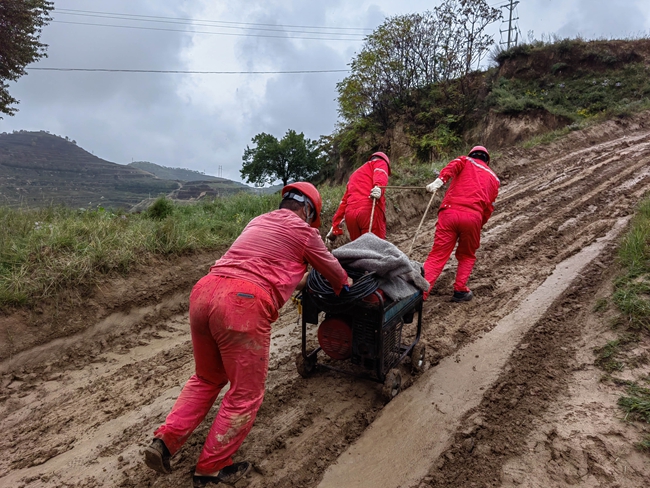 同一时间,在桐川作业区由于镇50增急需一批加药药剂,但送药车辆被困在距离井场1.5公里外的泥泞中无法进入。得知情况后,班组长王勇刚立刻带领2名员工,冒着雨蹚着泥水,用肩膀将十几桶药剂硬是扛到井场。雨水、汗水湿透了全身,沉重的药剂桶在肩上勒出深痕,但没有一个人抱怨。“生产等不起,我们慢一分钟,可能就影响一口井的产量。”刘斌喘着粗气,眼神却异常坚定。在镇七增路段,积水已没过小腿,党员突击队队长米伟宁带头跳进冰冷的水中,用手摸索堵塞的排水口,其他队员紧随其后,用铁锨、镐头清理淤泥杂物。冰冷刺骨的雨水冻得人直打哆嗦,但他们干劲十足,连续奋战5个小时,终于疏通了排水,确保了道路畅通。