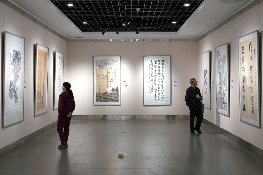 10月9日,市民正在平凉市美术馆观看“翰墨庆华诞 人民颂盛世”全市人大系统主题书画展览。