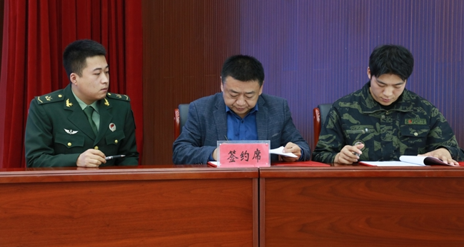 中核五公司技术支持单位——甘肃千江建设工程有限公司总经理郭海伟与优秀学员代表签订中核五公司技术支持用工协议。三方共同签订“政校企”合作退役军人就业培训框架协议。