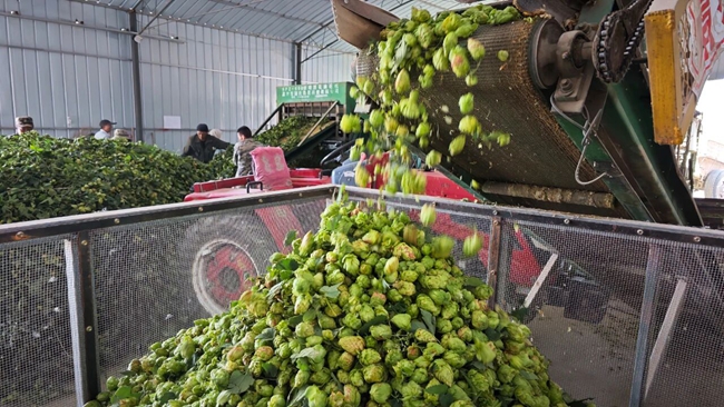 与传统农业的“人海战术”不同,啤酒花采收已逐步实现机械化。采摘机轰鸣而过,将挂满果实的藤蔓从高空钢丝上切割、分离,并迅速运输到精选机器上将球果与枝叶分离,采摘、输送、初选一气呵成,最大程度减少了人工采摘劳动力成本,同时加强了质量管控。从品种选育、节水滴灌到有机施肥,公司建立了全程可追溯的质量管控体系,为整个产业链奠定坚实品质基础的第一步。