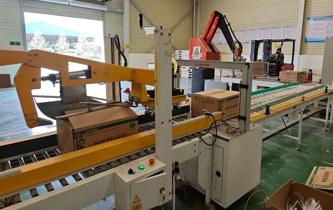 压缩花经过精细的筛选和除杂,去除任何可能残留的茎叶等杂质。随后,啤酒花被送入粉碎机中,被均匀粉碎成细小的粉末。粉末被送入压粒机,在高温高压下,粉末强制通过模具上的小孔,被挤压成短圆柱形颗粒。最终,这些还带着余温的深绿色颗粒经过冷却、筛分,由自动化设备装入内衬铝箔的真空包装袋中,并充入惰性气体进行保护,一箱箱印有“亚盛绿鑫”标志的啤酒花颗粒产品,即将发往各大知名啤酒厂商,最终融入一杯杯醇香的啤酒中。