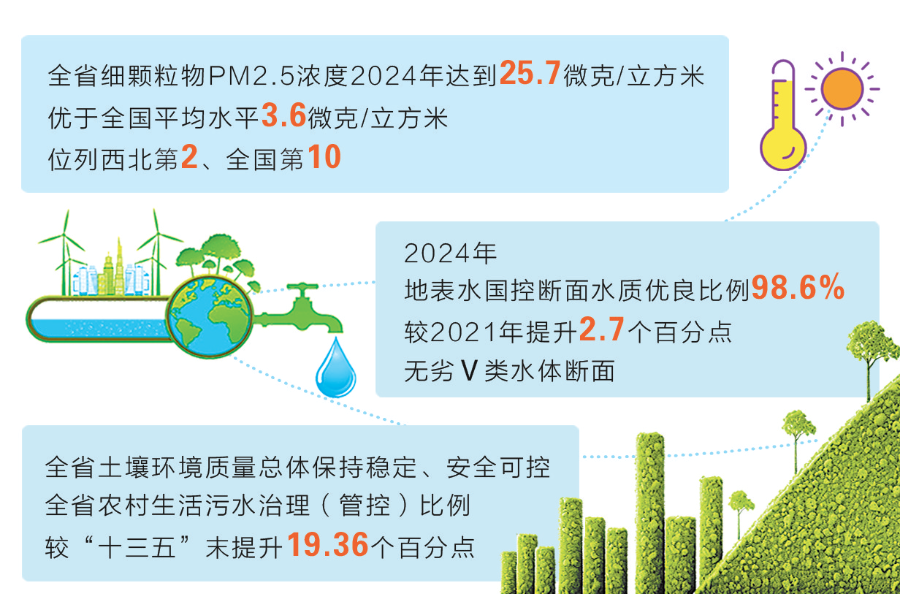 “十四五”时期,我省坚持精准、科学、依法治污,持续深入打好蓝天、碧水、净土保卫战,全省生态环境质量持续改善,“十四五”主要污染物总量减排任务提前完成。2024年,全省细颗粒物PM2.5浓度达到25.7微克/立方米,优于全国平均水平3.6微克/立方米,位列西北第二、全国第十;全省水生态环境质量状况持续向好,2024年地表水国控断面水质优良比例98.6%,较2021年提升2.7个百分点,无劣Ⅴ类水体断面;“十四五”以来,全省土壤环境质量总体保持稳定、安全可控,农村生活污水治理(管控)比例达到40.45%,较“十三五”末提升19.36个百分点。