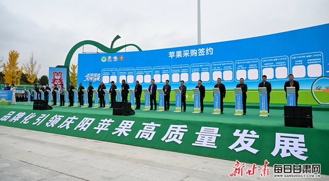 开幕式上,浙江大学CARD中国农业品牌研究中心发布庆阳苹果品牌价值成长报告,西北农林科技大学苹果研究中心发布庆阳新优苹果品质鉴评结果,果企果商代表作了分享发言。中国品牌杂志社与庆阳市果业发展中心签署庆阳国际苹果产业与品牌协作中心合作共建协议,中国联合国采购促进会与甘肃居立生态农业科技有限责任公司签署庆阳苹果国际公共采购服务平台合作共建协议,中国农业科学院果树研究所与甘肃居立苹果苗木繁育有限公司签署国家落叶果树脱毒中心庆阳苹果无病毒苗木专家工作站共建协议。庆阳市果企果商、果业合作社等与北京、广东、重庆等地果企果商和大宗市场大宗采购商现场签约购销协议20份,大会期间带动线下线上签约订购协议120份,订购苹果60.06万吨,预计签约金额55亿元。
