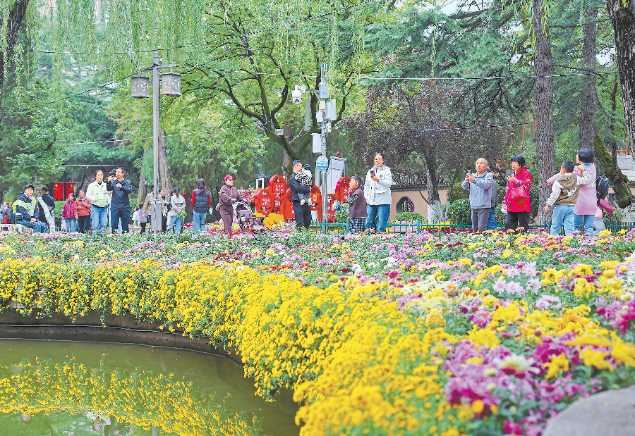 10月18日,市民在天水市秦州区人民公园欣赏菊花。当日,“金秋菊韵·诗意秦州”2025(乙巳)年秦州区第十三届主题菊展在人民公园开展。新甘肃·甘肃日报记者 冯乐凯