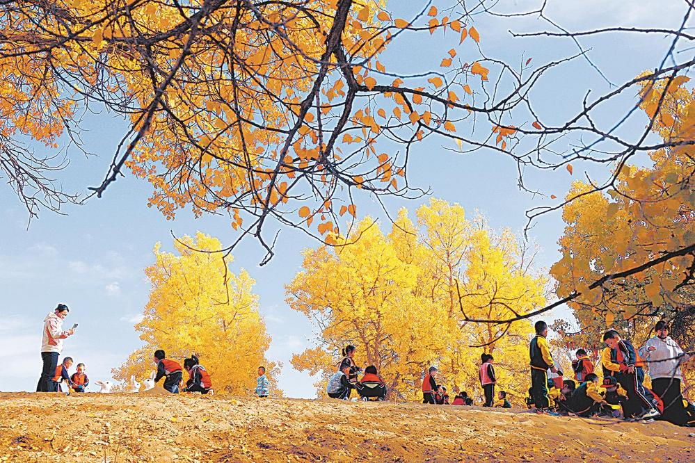 金秋时节,高台县黑泉镇十坝村的九头胡杨林景区层林尽染,景色如画,吸引游客观赏打卡。 张掖日报记者 张 渊 摄