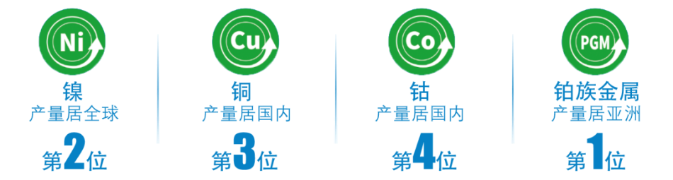金川集团在国内20个省(市、区)和海外30余个国家开展有色金属矿产资源开发及产业、科技、供应链合作,形成了镍钴、铜贵、电池材料、有色金属新材料、化工、新能源、生产性服务业等七大产业,具备年产电镍19万吨、羰基镍1万吨、电钴7000吨、四氧化三钴1.2万吨、铜160万吨、铂族金属13吨、金100吨、银1000吨、硒300吨和化工产品900万吨的生产能力,电镍产量全球第二、铜产量国内第三、钴产品产量国内第四、矿产铂族金属产量亚洲第一。