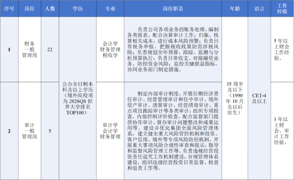 本次招聘的财务和审计一般管理人员,将结合业务发展需要、岗位配置缺口、应聘者岗位匹配度等,统筹分配。应聘岗位招满的,可在本次招聘岗位范围内提供调剂机会。