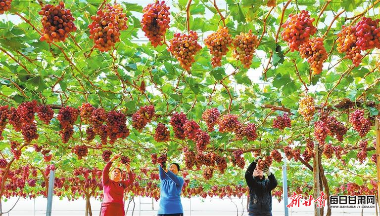 近日,在临泽县诚坤戈壁农业公司种植大棚内,工人正在采摘晚熟葡萄。 新甘肃·甘肃日报通讯员 王将