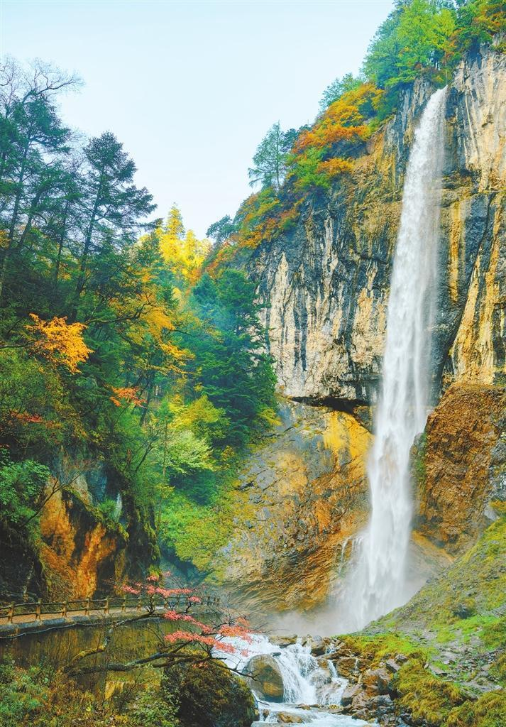 第一站是“官鹅天瀑”。下车步行不过百米,便听见“哗哗”的水声从密林深处传来,像无数根琴弦被秋风拨动。循着声音穿过一片落叶松林,眼前豁然开朗——一道瀑布从数十米高的崖壁上倾泻而下,如银河落九天,砸在谷底的深潭里,激起层层白雾。潭水碧绿如翡翠,倒映着崖壁上的红叶与黄叶,水雾中若隐若现,恍若仙境。瀑布周围的岩石上长满了青苔,湿漉漉的,沾着从潭里溅起的水珠,几只蜻蜓停在上面,翅膀透明得像琉璃。仰头望去,崖顶的野菊开得正盛,金黄的花瓣在风中颤动,偶尔有花瓣被风吹落,飘进瀑布的水流里,转瞬便被卷进潭中,成了这秋景里一闪而过的点缀。