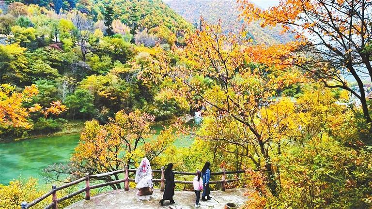 进了山门,秋意便如潮水般涌来。景区的观光车沿着峡谷蜿蜒前行,车窗外的景色让人应接不暇:两侧的山体陡峭如削,裸露的岩石呈青灰色,却被漫山的树木织成了彩色的锦缎——油松是墨绿的底色,桦树的叶子黄得像蜜,山杨的叶边镶着胭脂红,连低矮的灌木丛都缀满了橙红、绛紫的浆果。阳光从枝叶的缝隙里漏下来,在路面上投下光斑,像撒了一地金箔。