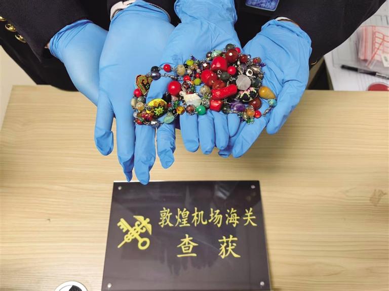每日甘肃网10月28日讯 据兰州晚报报道 日前,兰州海关所属敦煌机场海关在对进境航班进行监管时,发现一名选择“无申报通道”(绿色通道)通关的旅客行李机检异常,经现场关员人工查验,在其随身物品中查获项链1串、共计157颗珠子。初步判断,其中有20颗珠子疑似红珊瑚制品。