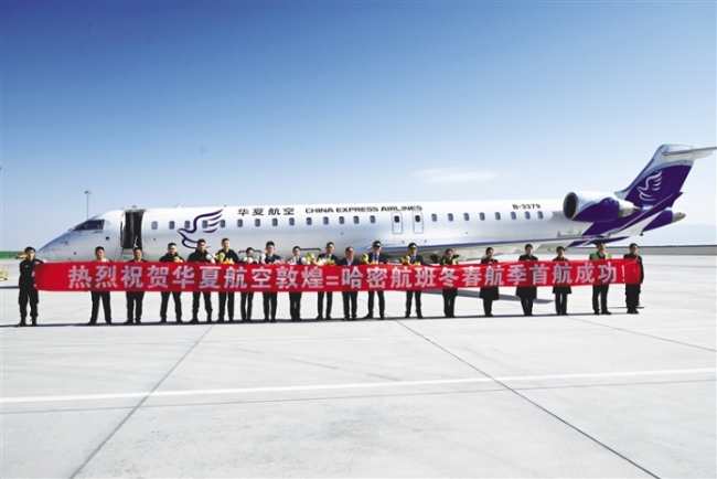 每日甘肃网10月28日讯 据酒泉日报敦煌报道 10月26日,敦煌至哈密航班首次在冬春航季开通。该航线由华夏航空执飞,每周一、三、五、日运行,不仅完善了西北区域航空网络,更将有力推动敦煌与新疆在旅游资源共享、特色贸易流通等领域的深度合作。同时,由华夏航空公司执飞的陇南?兰州?敦煌航线也在当日首次开通,每周一、三、五、日运行。