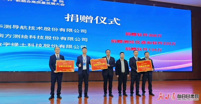 签约仪式后,上海华测导航技术股份有限公司、广州南方测绘科技股份有限公司、北京数字绿土科技股份有限公司向甘肃建筑职业技术学院捐赠了测绘仪器和软件。