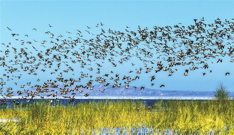 湿地公园所在区域是石羊河流入民勤盆地后,唯一由河流湿地、沼泽湿地、人工湿地形成的复合湿地生态系统,是鸟类迁徙线路上重要的停歇地。张兆仁告诉记者,近几年,水鸟明显增多,最新监测数据显示,这里有4万多只越冬水鸟。