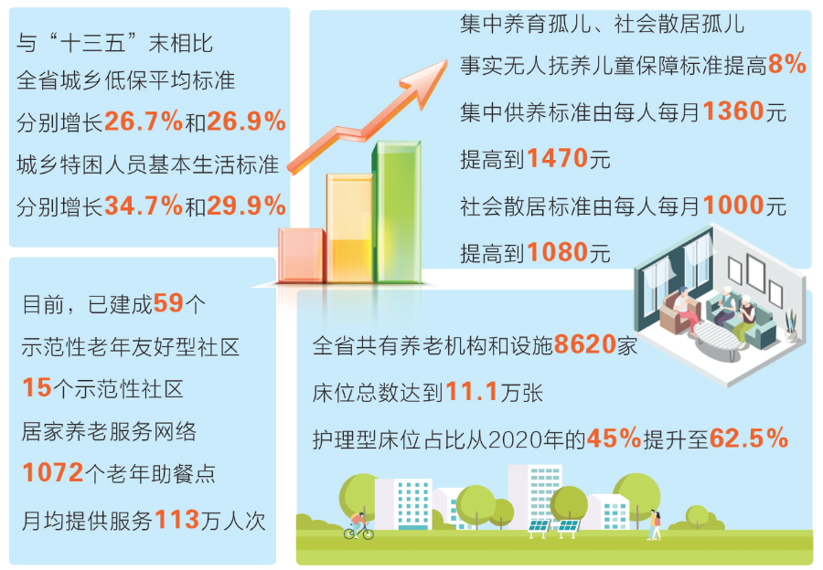 “十四五”时期,我省织密扎牢基本民生保障网,通过构建分层分类社会救助体系,将救助覆盖范围从低保对象、特困人员拓展到低保边缘家庭和刚性支出困难家庭,推动专项救助覆盖更多困难群众。与“十三五”末相比,全省城乡低保平均标准分别增长26.7%和26.9%,城乡特困人员基本生活标准分别增长34.7%和29.9%,有效保障了困难群众基本生活;集中养育孤儿、社会散居孤儿、事实无人抚养儿童保障标准提高8%,集中供养标准由每人每月1360元提高到1470元,社会散居标准由每人每月1000元提高到1080元;困难残疾人生活补贴、重度残疾人护理补贴制度有效落实,截至2024年底,累计发放“两补”资金31.8亿元,保障困难残疾人28.8万人、重度残疾人38.4万人。