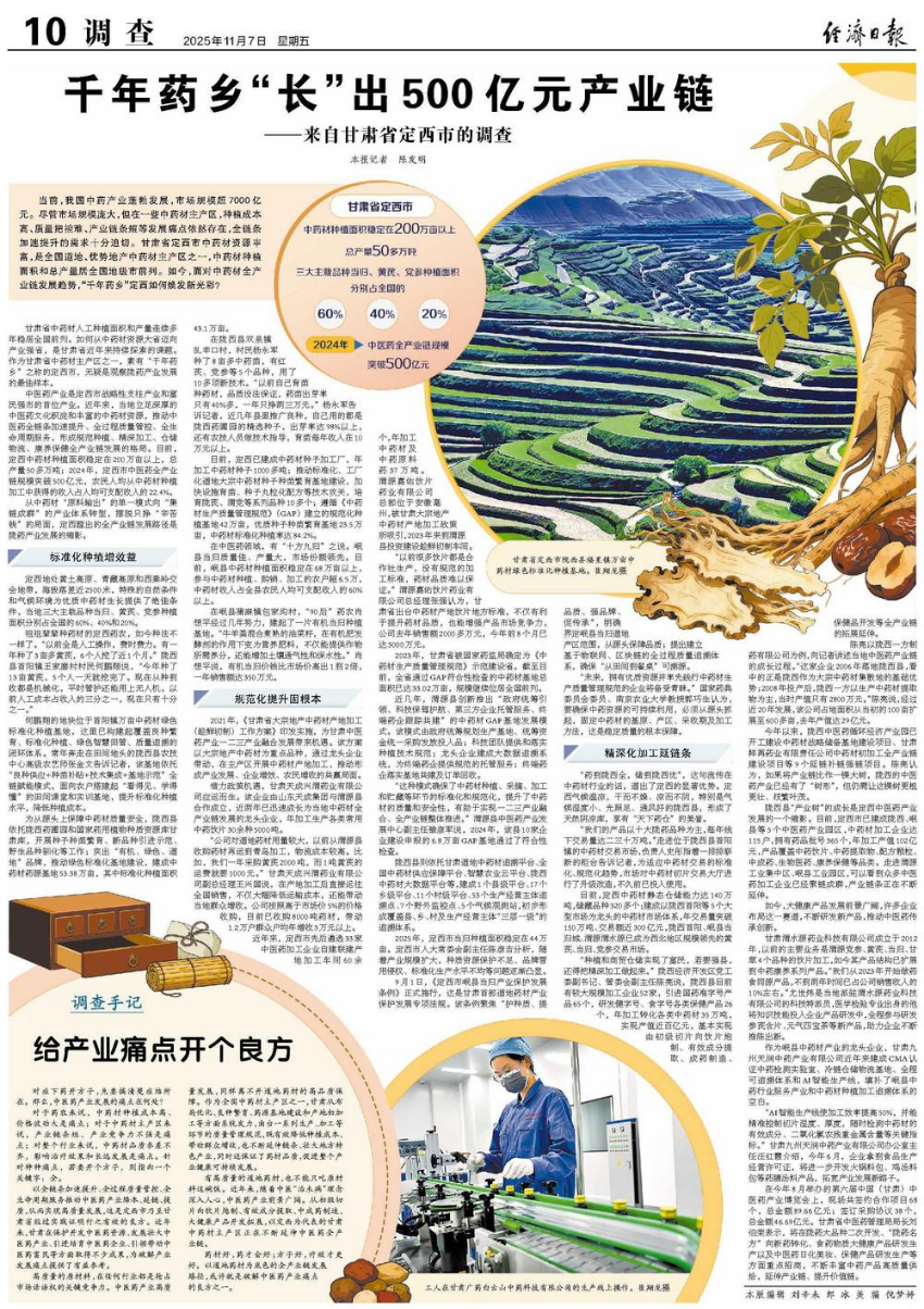 中医药产业是定西市战略性支柱产业和富民强市的首位产业。近年来,当地立足深厚的中医药文化积淀和丰富的中药材资源,推动中医药全链条加速提升、全过程质量管控、全生命周期服务,形成规范种植、精深加工、仓储物流、康养保健全产业链发展的格局。目前,定西中药材种植面积稳定在200万亩以上,总产量50多万吨;2024年,定西市中医药全产业链规模突破500亿元,农民人均从中药材种植加工中获得的收入占人均可支配收入的22.4%。