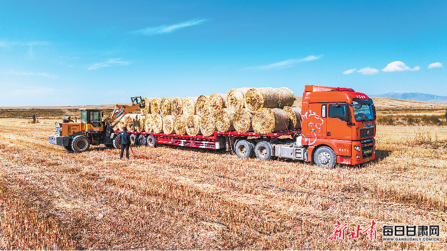 近日,天祝县泰润民农机服务农民专业合作社燕麦种植基地内,工人在收获牧草。新甘肃·甘肃日报通讯员 赵世鹏