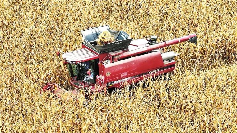 时下,新区项目建设中心籽粒玉米种植基地里,沉甸甸的金黄果穗压弯秸秆,2台大型联合收割机往来穿梭,切割、摘穗、脱粒一气呵成。田埂边,合作社社员手持测产仪记录数据,捧着饱满的玉米籽粒,笑意绽满脸庞。