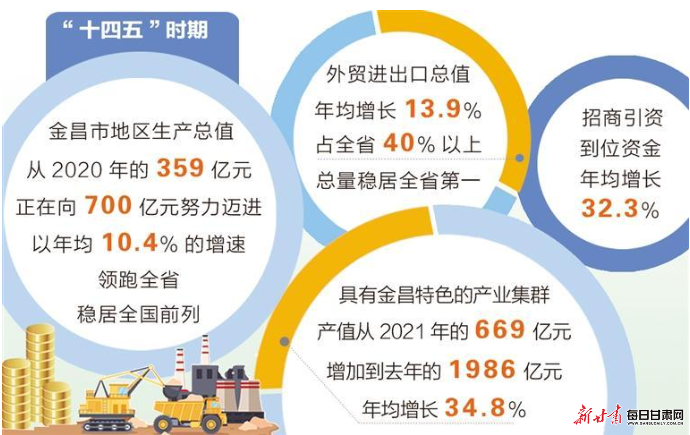 每日甘肃网兰州讯(新甘肃·甘肃日报记者 杜雪琴)11月14日,记者从省政府新闻办召开的“决胜收官‘十四五’ 争先进位话发展”主题系列新闻发布会上获悉,金昌市地区生产总值从2020年的359亿元,连跨400亿元、500亿元、600亿元台阶,正在向700亿元努力迈进,以年均10.4%的增速领跑全省、稳居全国前列,经济实力实现大跨越。
