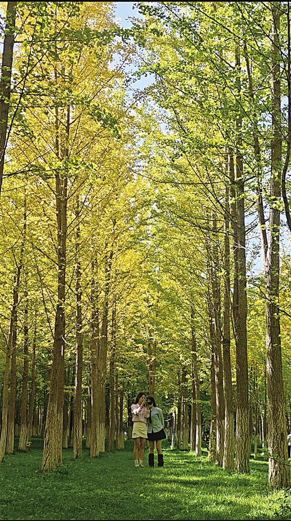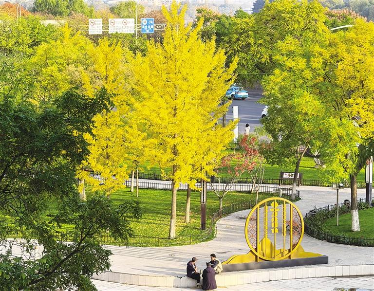 市民在公园的银杏树下休闲娱乐。