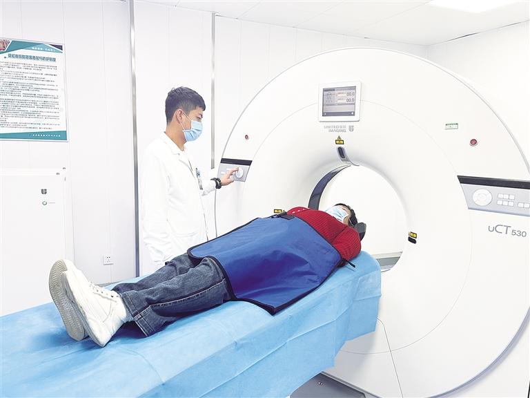 秦川中心卫生院放射技师正在为村民何成秀做CT检查