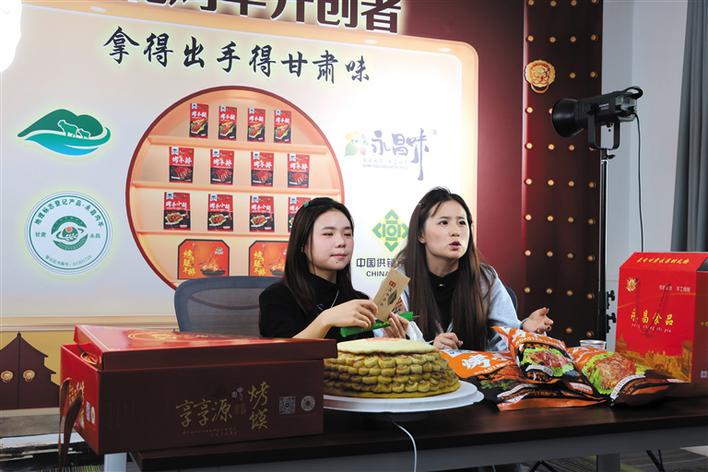 11月12日,甘肃丝路珍宝电商孵化基地的直播间里,主播们用地道的永昌方言推介羊肉、烤馍、月饼等产品。网络直播让永昌各类特产直达全国消费者手中,把永昌味道传播到全国各地。 记者 董振虎 摄